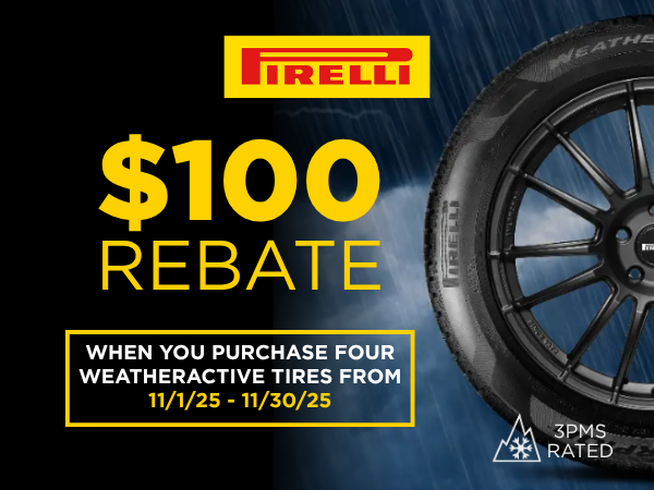 From November 1, 2025 – November 30, 2025, customers who purchase a new set of CINTURATO™ or SCORPION™ WEATHERACTIVE™ tires are eligible to receive a $100 Pirelli Mastercard® Prepaid card.
