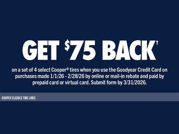 Get $75 Back Offer Valid Through February 28, 2026 Click Here to Shop Tires! Back Share on Facebook - Get $75 Back (opens in a new window)Share on Twitter - Get $75 Back (opens in a new window)Share on LinkedIn - Get $75 Back (opens in a new window)