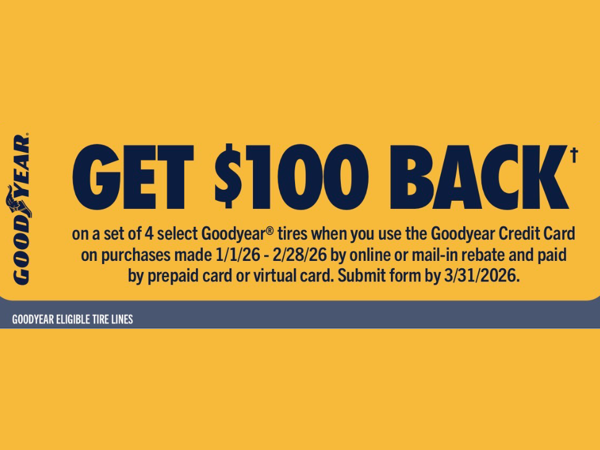 Goodyear Rebate Goodyear Rebate Get Up To $100 BACK on purchase of (4) four select Goodyear Tires. Valid until February 28, 2025 Shop Tires Now! Back Share on Facebook - Goodyear Rebate (opens in a new window)Share on Twitter - Goodyear Rebate (opens in a new window)Share on LinkedIn - Goodyear Rebate (opens in a new window)